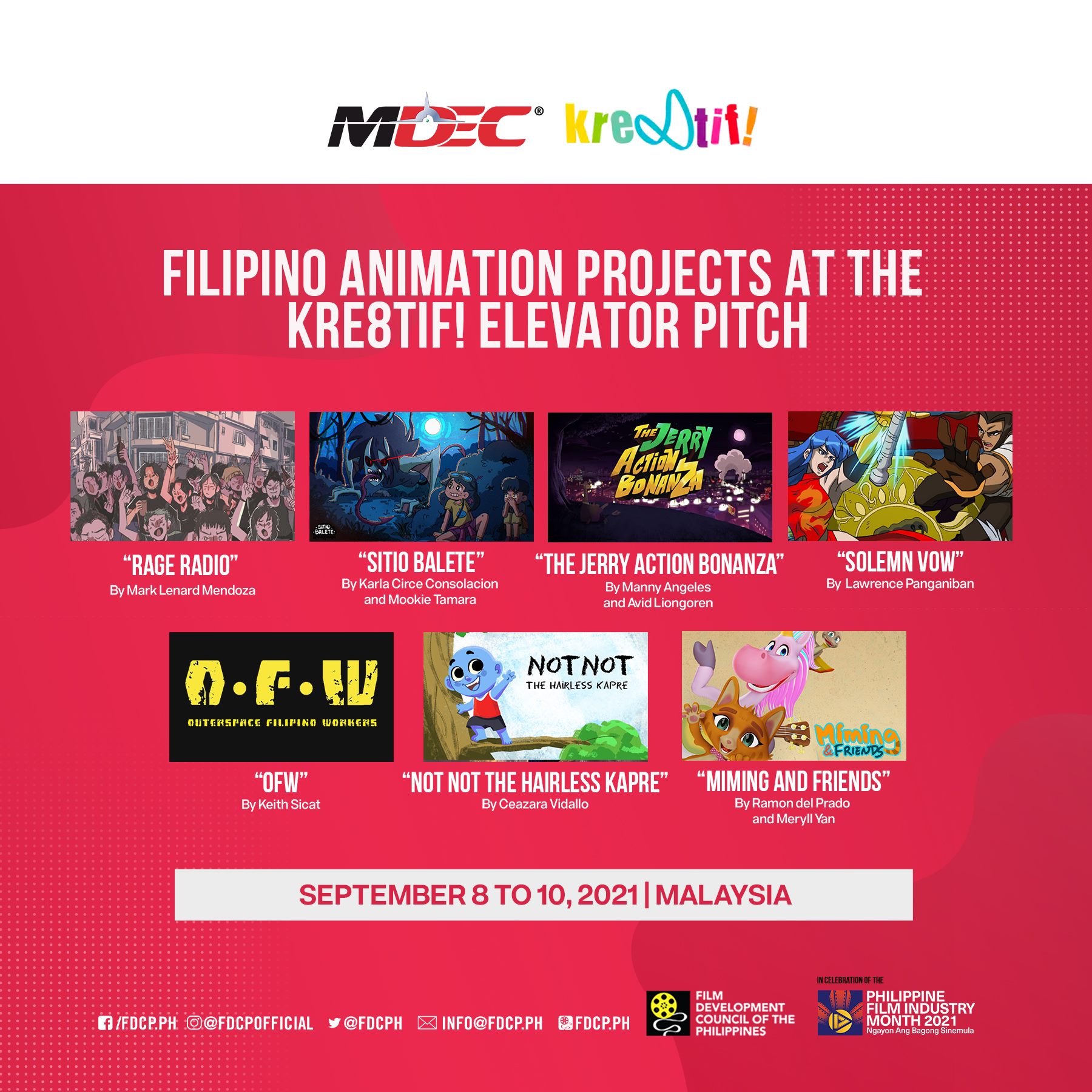 “In the past years, we have brought exceptional Filipino animators to Malaysia to pitch their animation projects in Kre8tif!. This year, seven projects were selected, making this the biggest number of projects to have been selected to participate. Congratulations to the delegates, this triumph is significant to the celebration of Philippine Film Industry Month, especially to our aspiring Filipino animators,” said FDCP Chairperson and CEO Liza Diño.